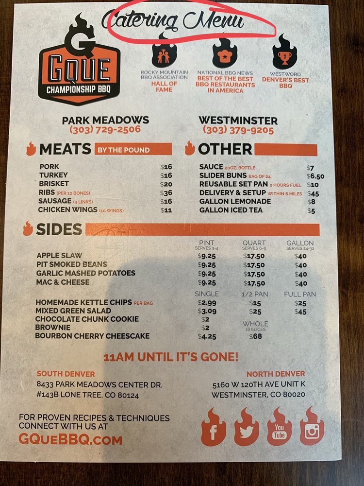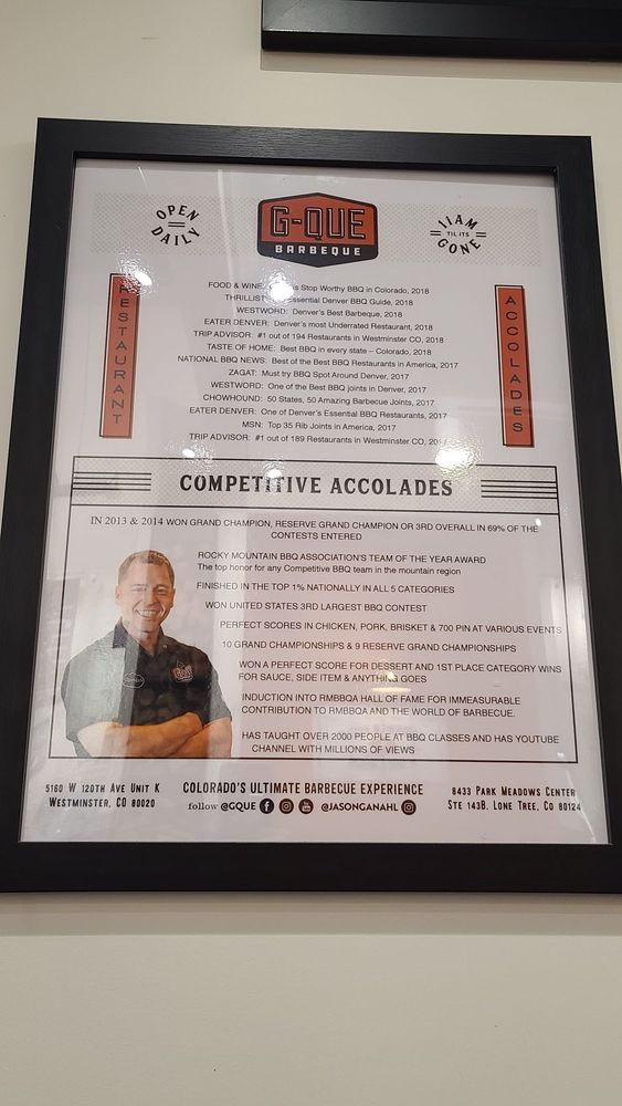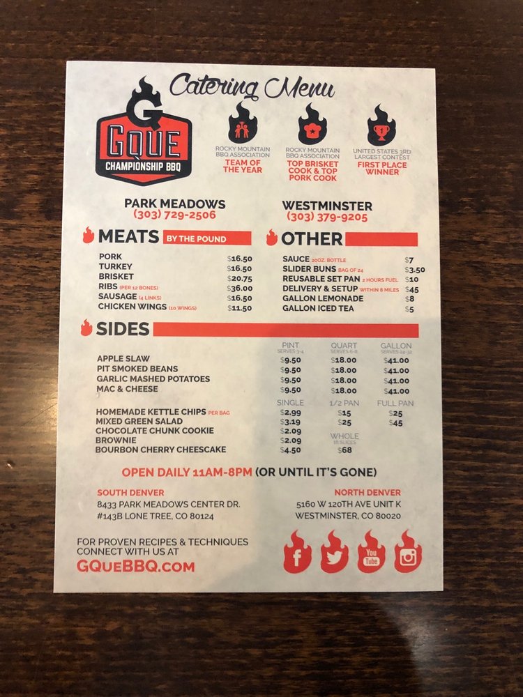 GQue BBQ - Lone Tree is a must-visit for BBQ enthusiasts in the Lone Tree area. The restaurant offers a wide range of BBQ options, including the popular GQueban Sandwich and Beef Brisket, all smoked to perfection. The Sandwich Combo Meal is a great value, including a sandwich, side, and drink. Customers rave about the quality of meats, proper smoking techniques, and balanced BBQ sauces. The cafeteria-style setup reduces costs for both customers and owners, making it an affordable and enjoyable experience for all. The staff exudes southern charm and the rewards program incentivizes repeat visits. Don't miss out on their delicious onion rings and ice cream shop inside. With stellar reviews and a convenient location near Park Meadows Mall, GQue BBQ - Lone Tree is a top choice for authentic American BBQ at great prices.